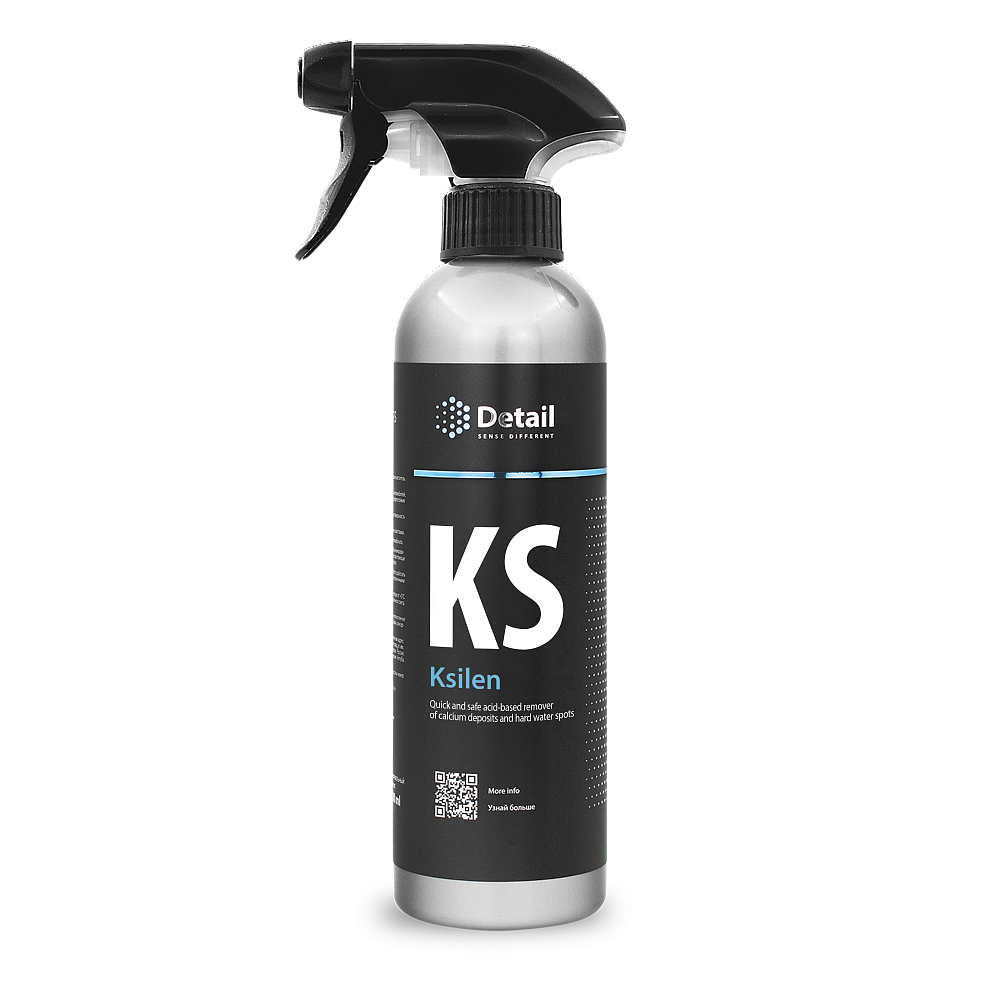 Ksilen (KS) - кислотный состав для быстрого и безопасного удаления кальциевых отложений и следов жесткой воды с кузова автомобиля. Рекомендуется применять сразу после образования водного камня на ЛКП. Состав: ≥30% вода очищенная; <5%: неионогенные ПАВ, органическая кислота, неорганическая кислота, ароматизирующая добавка, краситель. Способ применения: 1. Охладите обрабатываемую поверхность перед нанесением состава. 2. Высушите кузов автомобиля. 3. С помощью триггера нанесите состав на обрабатываемую поверхность. 4. Выдержите состав 1-2 минуты, не допуская высыхания. 5. Протрите чистым сухим полотенцем из микрофибры. 6. Смойте состав водой. 7. В случае неполного удаления загрязнения, повторите обработку.